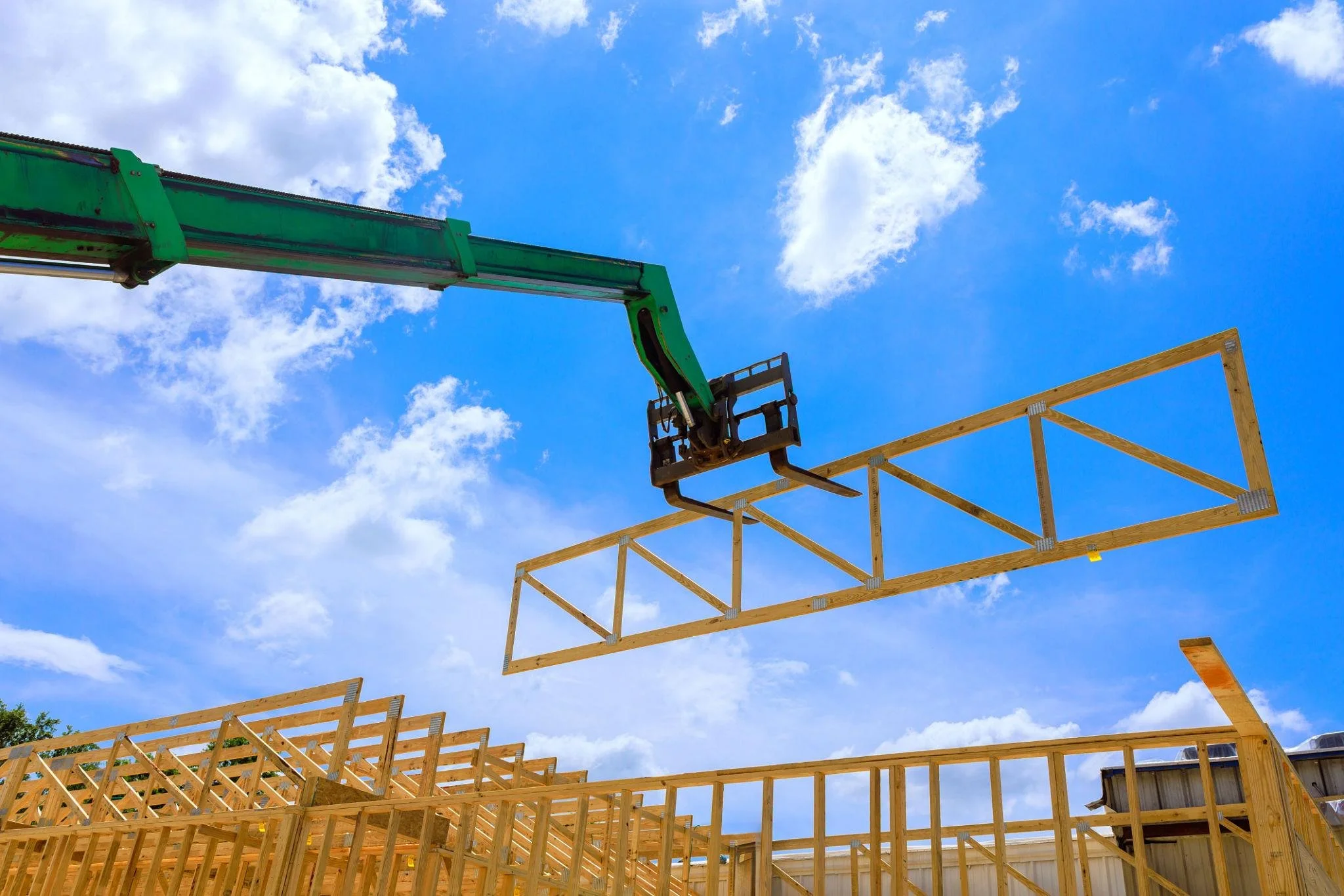 A boom truck equipped with a rotating knuckle crane and pallet forks for lifting and precise placement of construction materials.